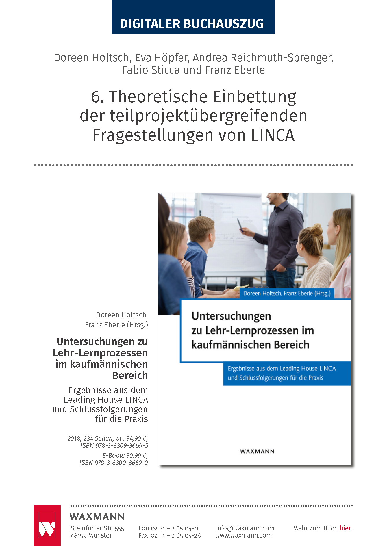 Holtsch, D., Höpfer, E., Reichmuth-Sprenger, A., Sticca, F., & Eberle, F. (2018). Theoretische Einbettung der teilprojektübergreifenden Fragestellungen. In D. Holtsch & F. Eberle (Hrsg.), Untersuchungen zu Lehr-Lernprozessen im kaufmännischen Bereich: Ergebnisse aus dem Leading House LINCA und Schlussfolgerungen für die Praxis (S. 161–170). Münster: Waxmann. https://doi.org/10.18747/phsg-coll3/id/698